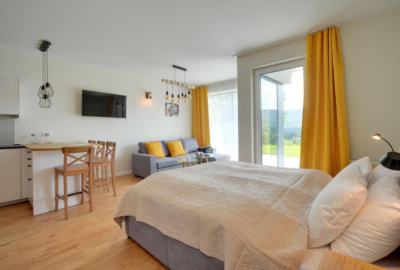 Apartament typu studio. This apartment includes 1 bedroom, kitchenette, a terrace and 1 bathroom with a shower. Meals can be prepared in the kitchenette, which has a stovetop, a refrigerator, a dishwasher and kitchenware. The apartment offers a flat-screen TV, a washing machine, a coffee machine, heating as well as mountain views. The unit has 2 beds. Apartament - 4 osobowy. Powierzchnia pokoju ok.: 34 mkw.